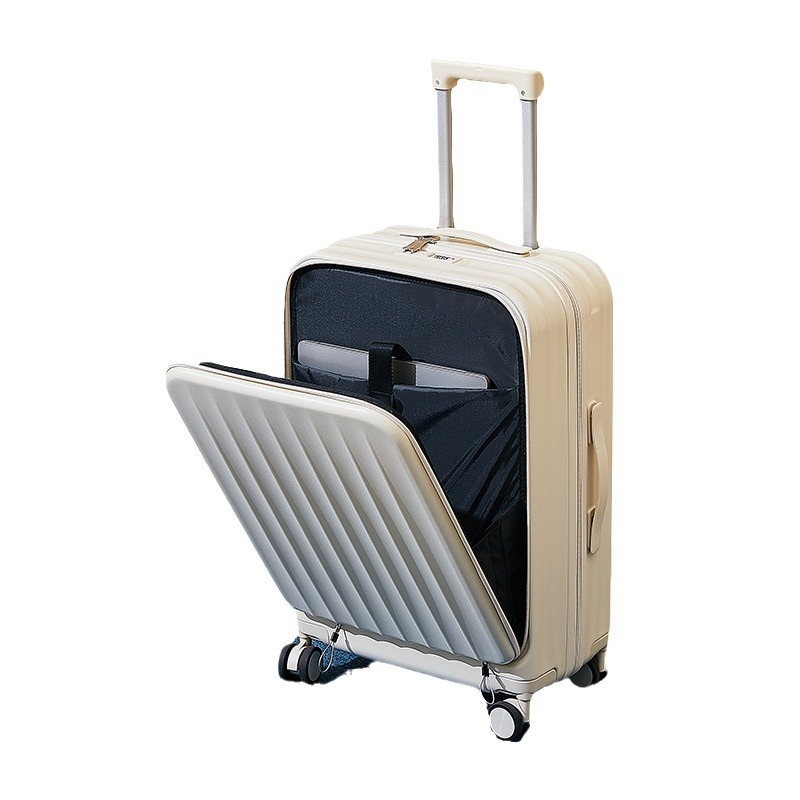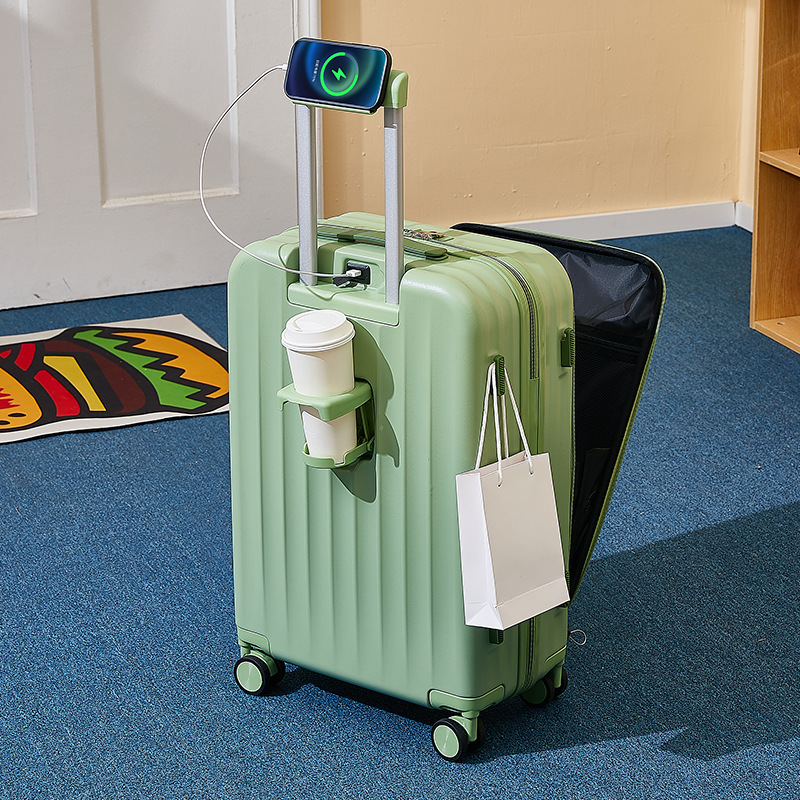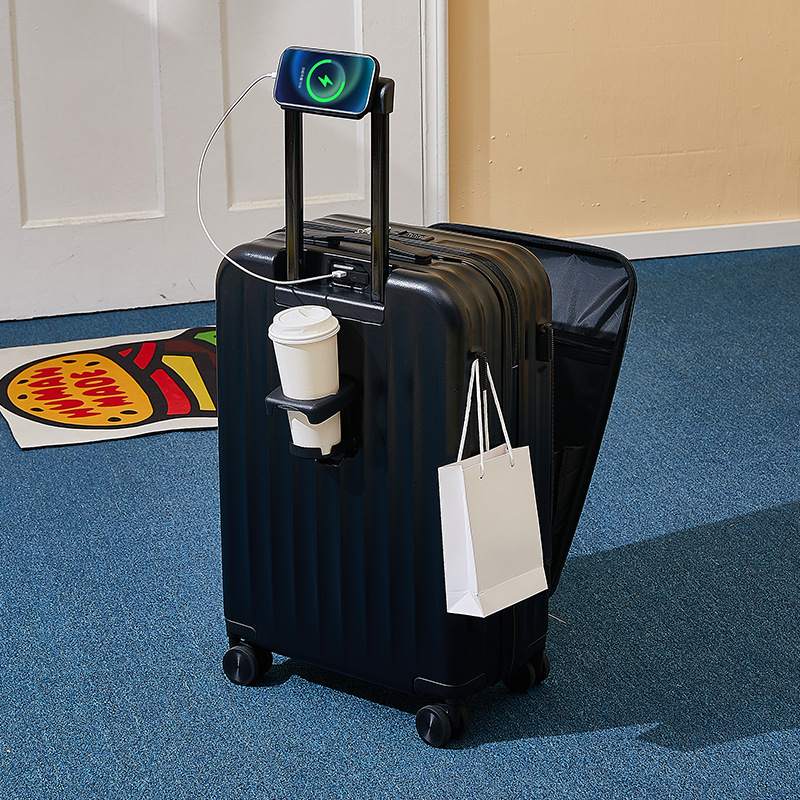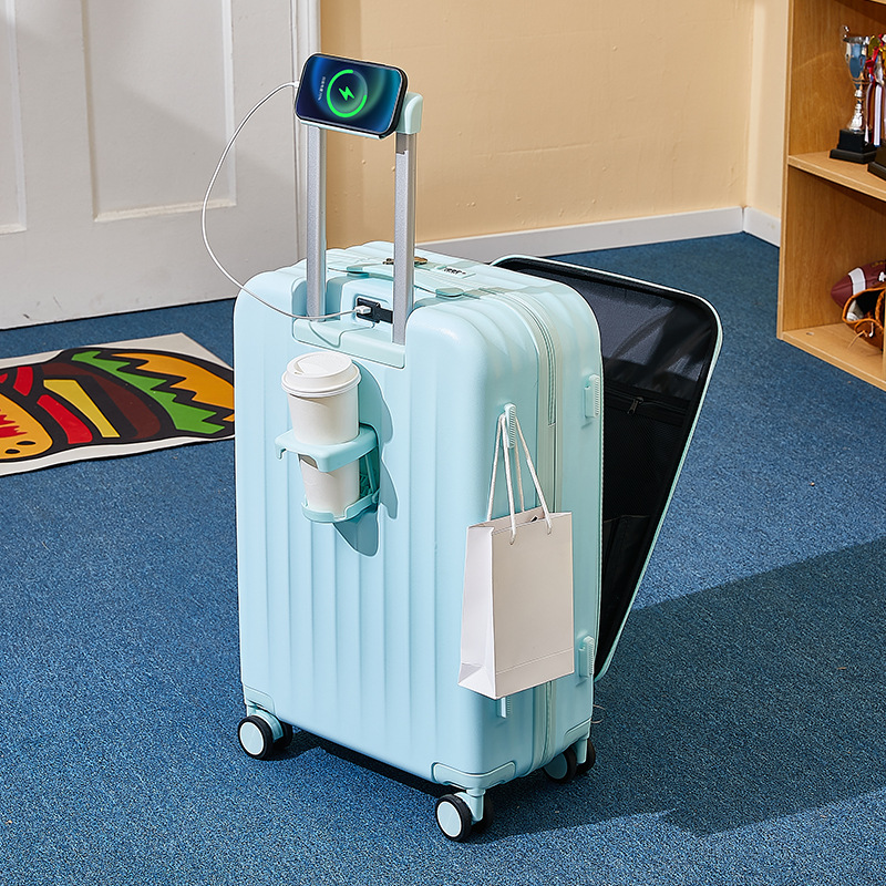 Front opening luggage compartment with USB charging and cup holder, travel case for women, front opening lid, 20 inch boarding case, suitcase for men