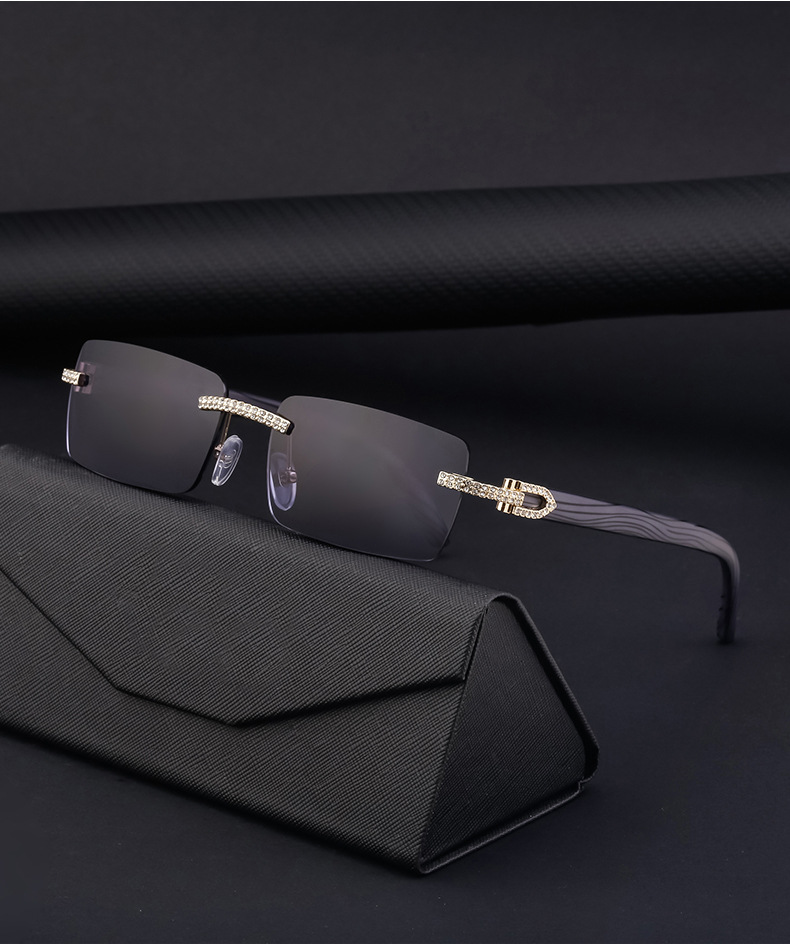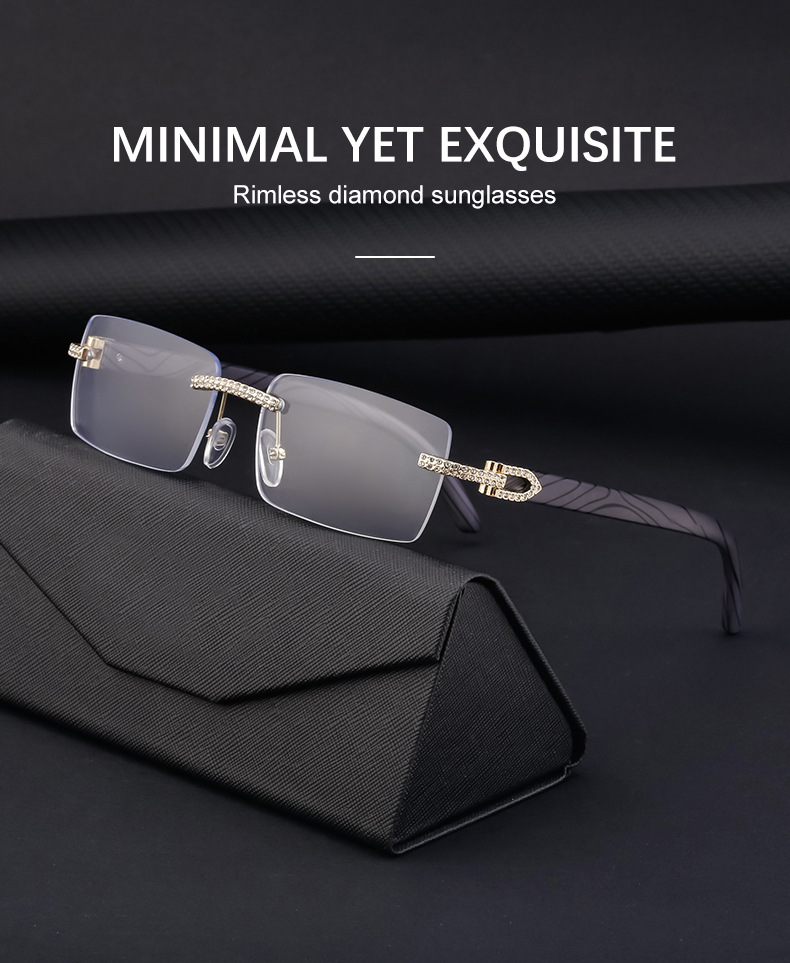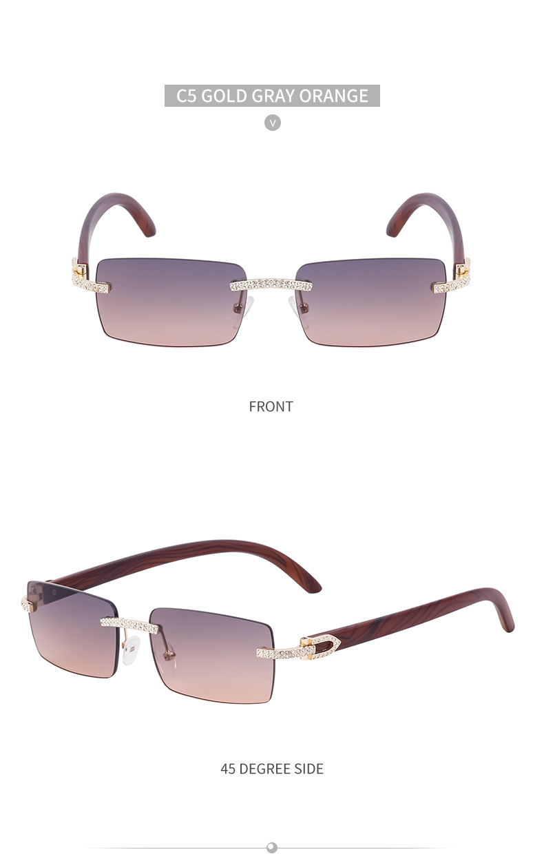 European and American retro frameless men's sunglasses with diamond inlaid wood grain legs, cross-border new glasses wholesale shapes