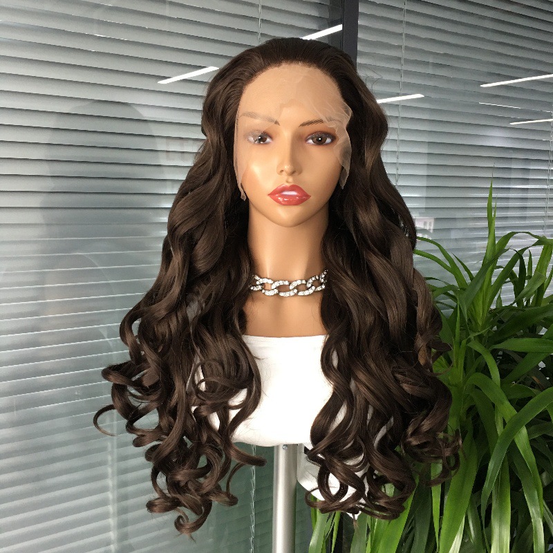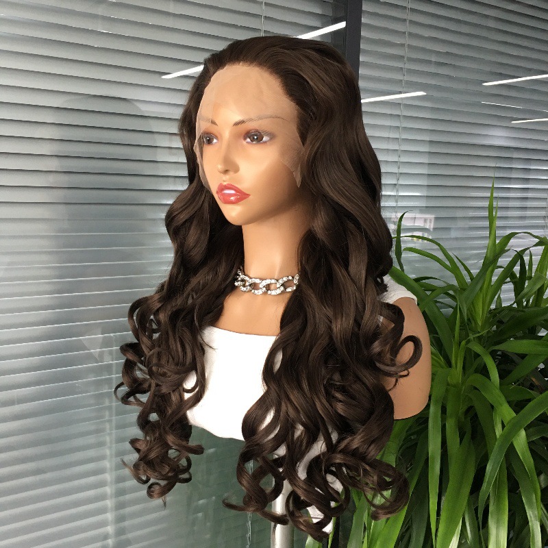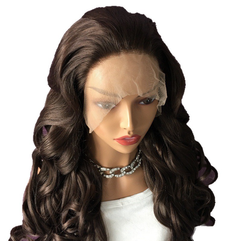 Manufacturer wholesale 13x4 synthetic front lace wig, dark brown, medium to large wave, cross-border European and American wig headband